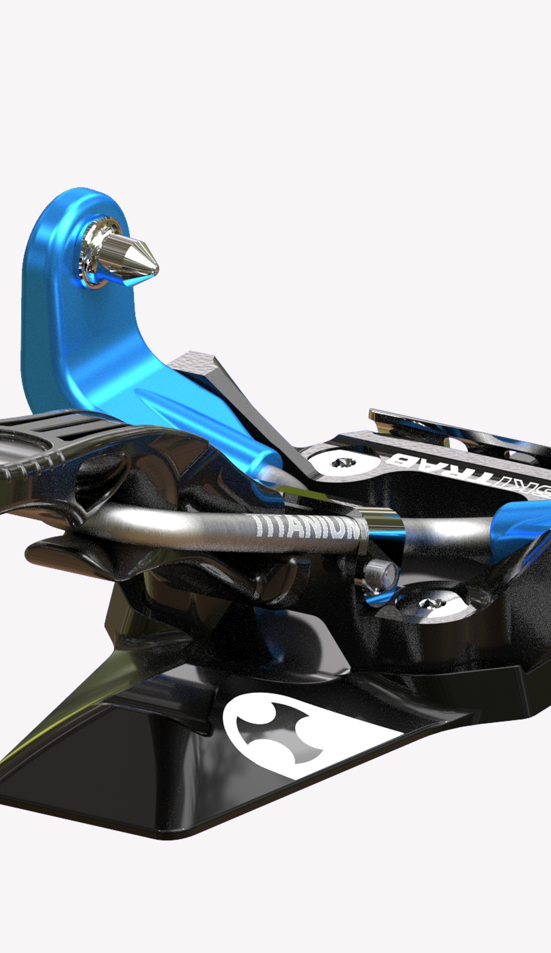 One simple component in titanium specially designed in its shape and structure links the two jaws in the toe unit. This extremely simple mechanism offers a significant guarantee of functionality and reliability. The toe unit jaws open with a light pressure on the front lever, which can be pressed either by hand or with a ski pole. Position the boot so that the jaw pins are level with the holes on the side of the boot, then release the lever so the jaws close locking the toe of the boot into place. Rotate the lever upwards to block the opening of the jaws. This special elastic component in titanium permits the toe unit to adapt perfectly to all types of boots, guarantees that the boot remains fixed in place and with the help of some particularly well finished and crafted pins it can clean out the boot inserts during use.