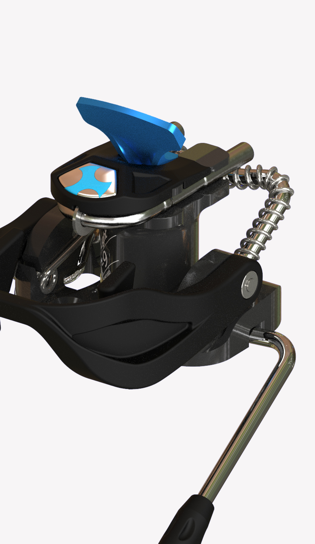 Un solo e semplice elemento in titanio particolarmente studiato nella sua forma e geometria collega le due ganasce del puntale. Questo meccanismo così semplice fornisce una importante garanzia di funzionalità e di affidabilità. L’apertura delle ganasce del puntale avviene con una facile pressione della leva anteriore, è possibile agire su quest’ultima con la mano o con il bastoncino. Nel momento in cui le spine delle ganasce sono allineate con i fori dello scarpone basta rilasciare la leva e le ganasce si chiudono bloccando la punta dello scarpone. Con la mano si ruota la stessa leva verso l’alto per bloccare l’apertura delle ganasce. Il particolare elemento elastico di titanio permette al puntale di adeguarsi perfettamente a tutti i tipi di scarponi, garantisce un ottimo bloccaggio dello scarpone e con l’aiuto di spine particolarmente rifinite e lavorate riesce a ripulire il foro scarpone durante l’uso.