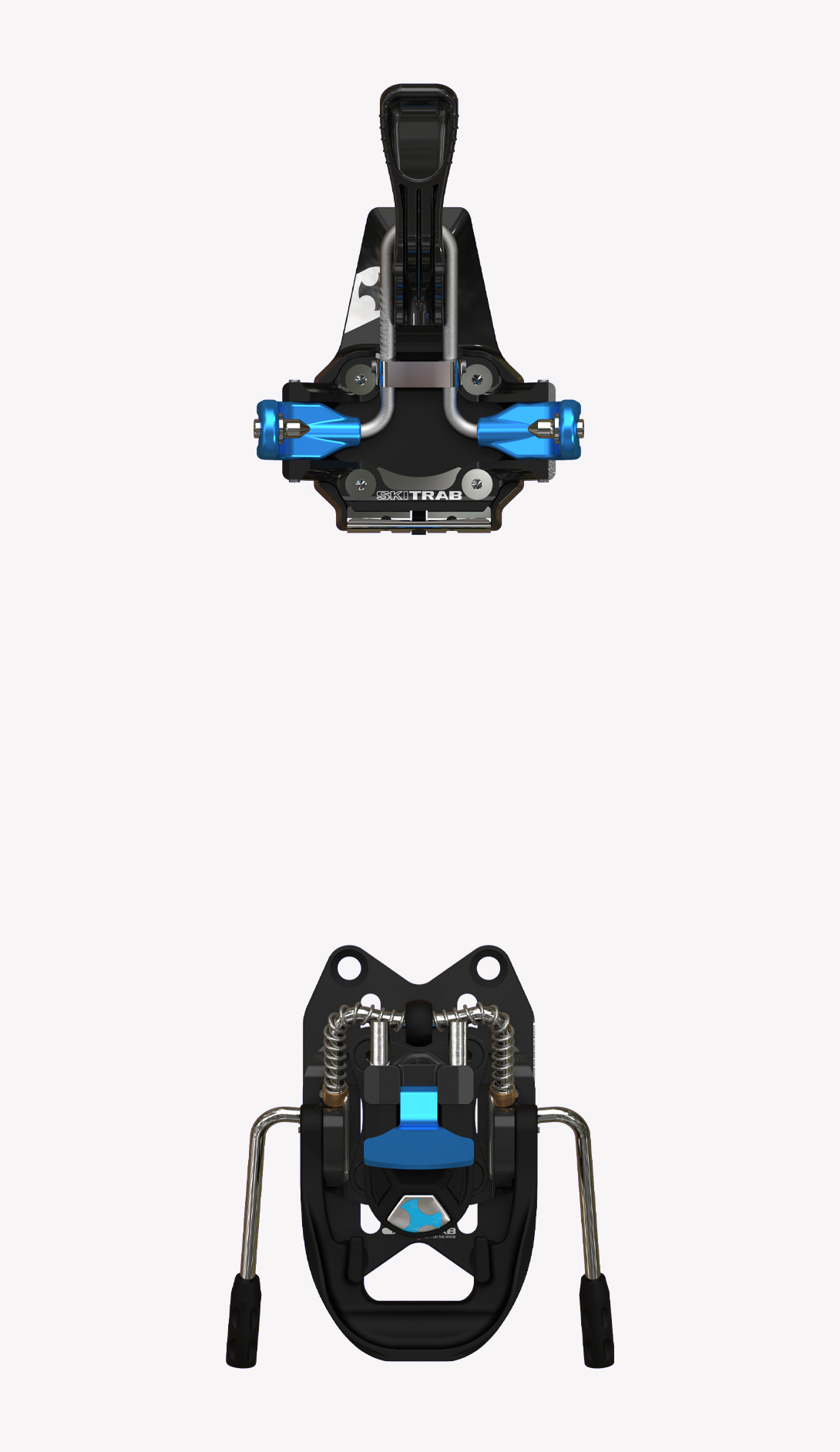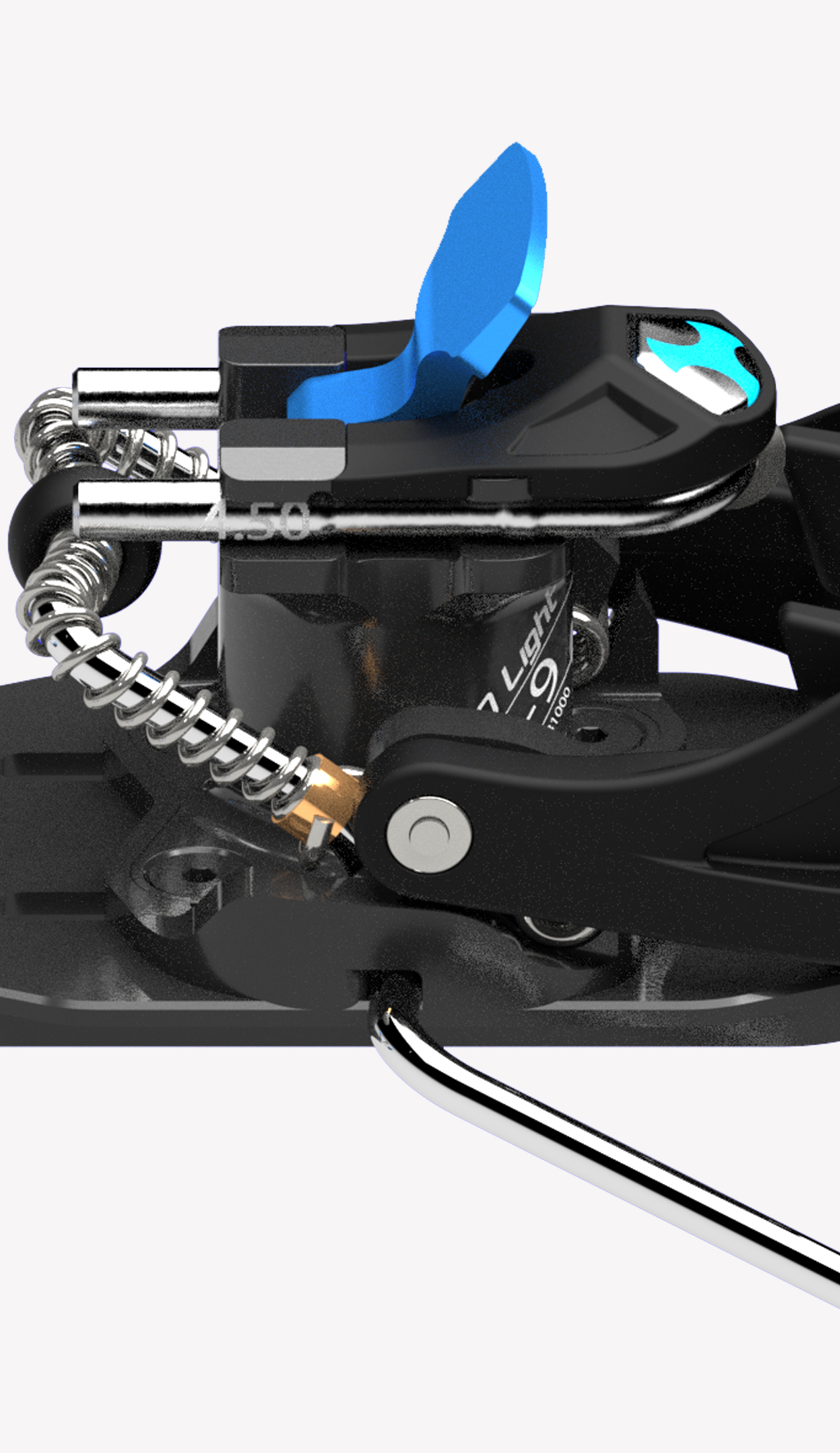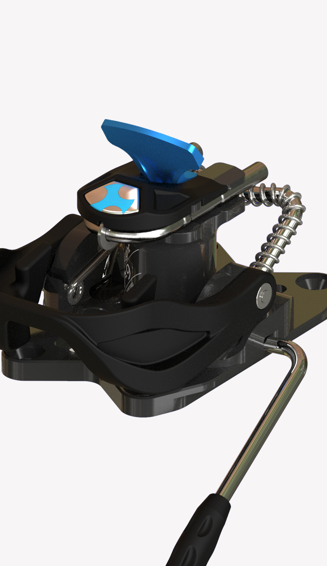 One simple component in titanium specially designed in its shape and structure links the two jaws in the toe unit. This extremely simple mechanism offers a significant guarantee of functionality and reliability. The toe unit jaws open with a light pressure on the front lever, which can be pressed either by hand or with a ski pole. Position the boot so that the jaw pins are level with the holes on the side of the boot, then release the lever so the jaws close locking the toe of the boot into place. Rotate the lever upwards to block the opening of the jaws. This special elastic component in titanium permits the toe unit to adapt perfectly to all types of boots, guarantees that the boot remains fixed in place and with the help of some particularly well finished and crafted pins it can clean out the boot inserts during use.
