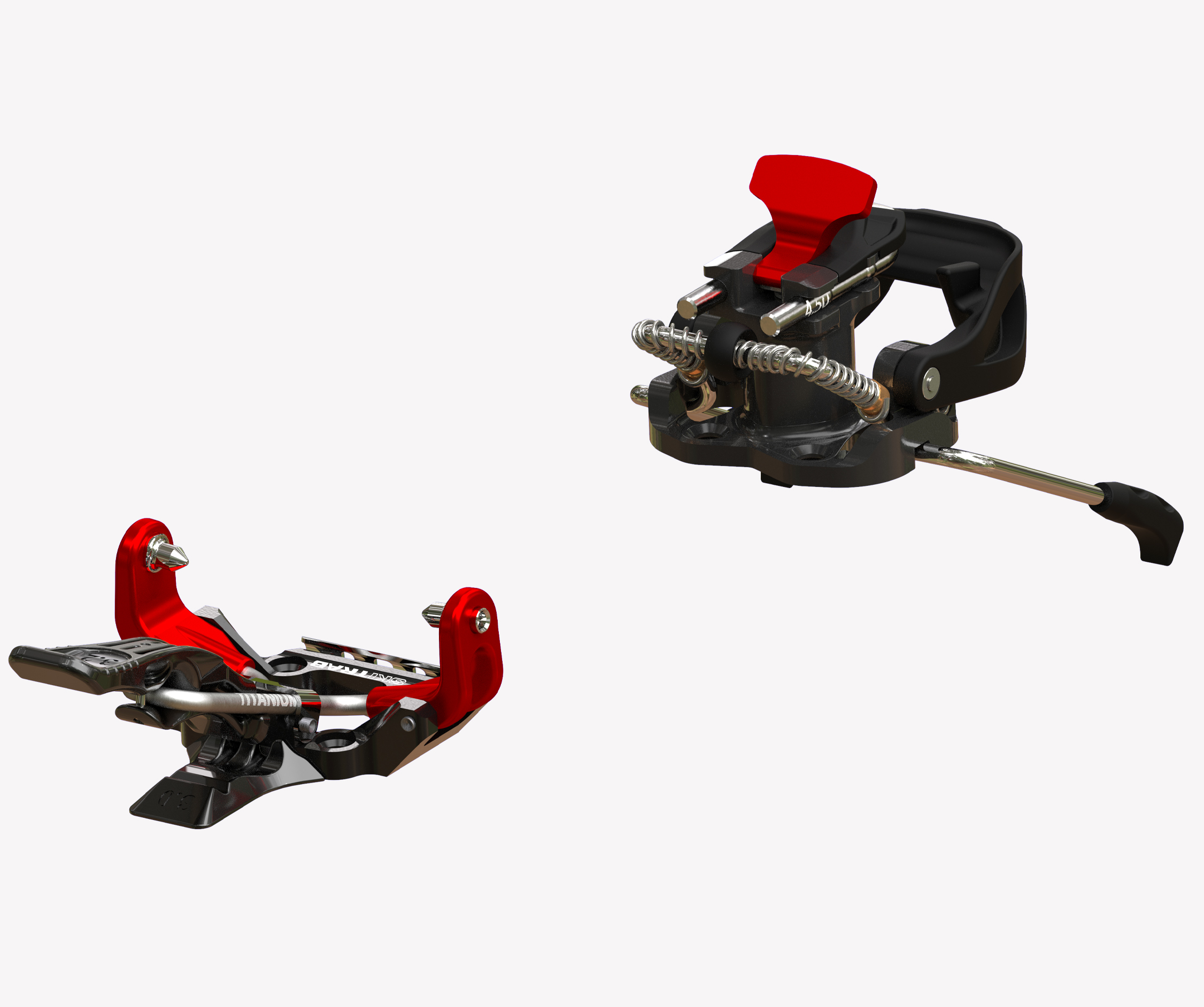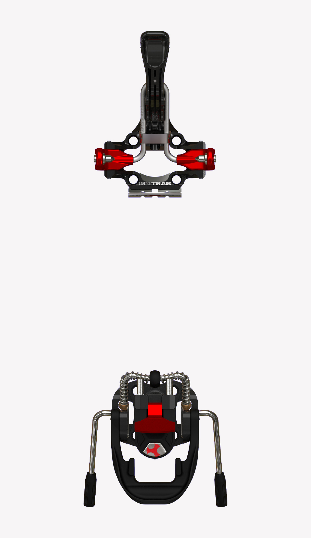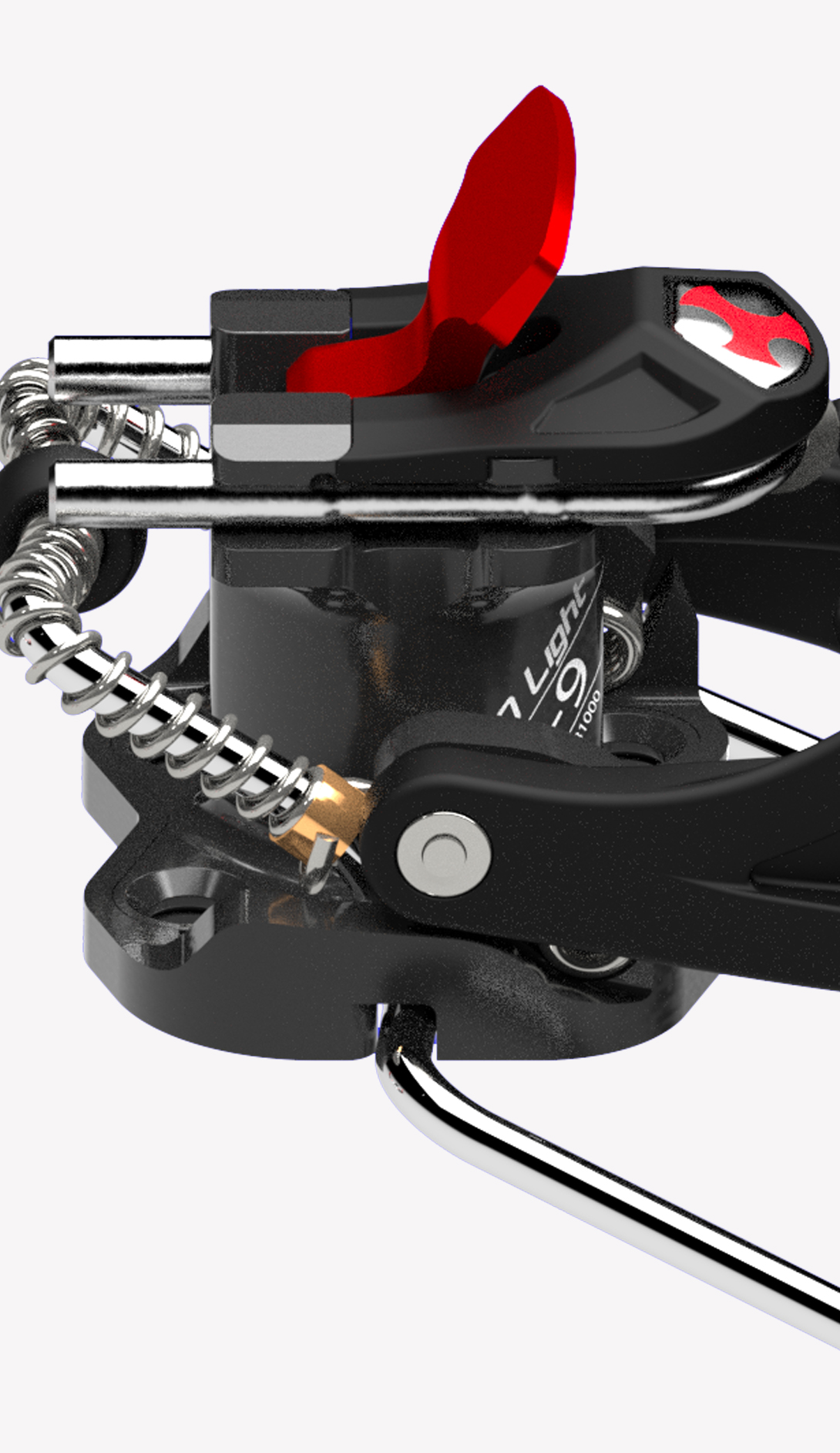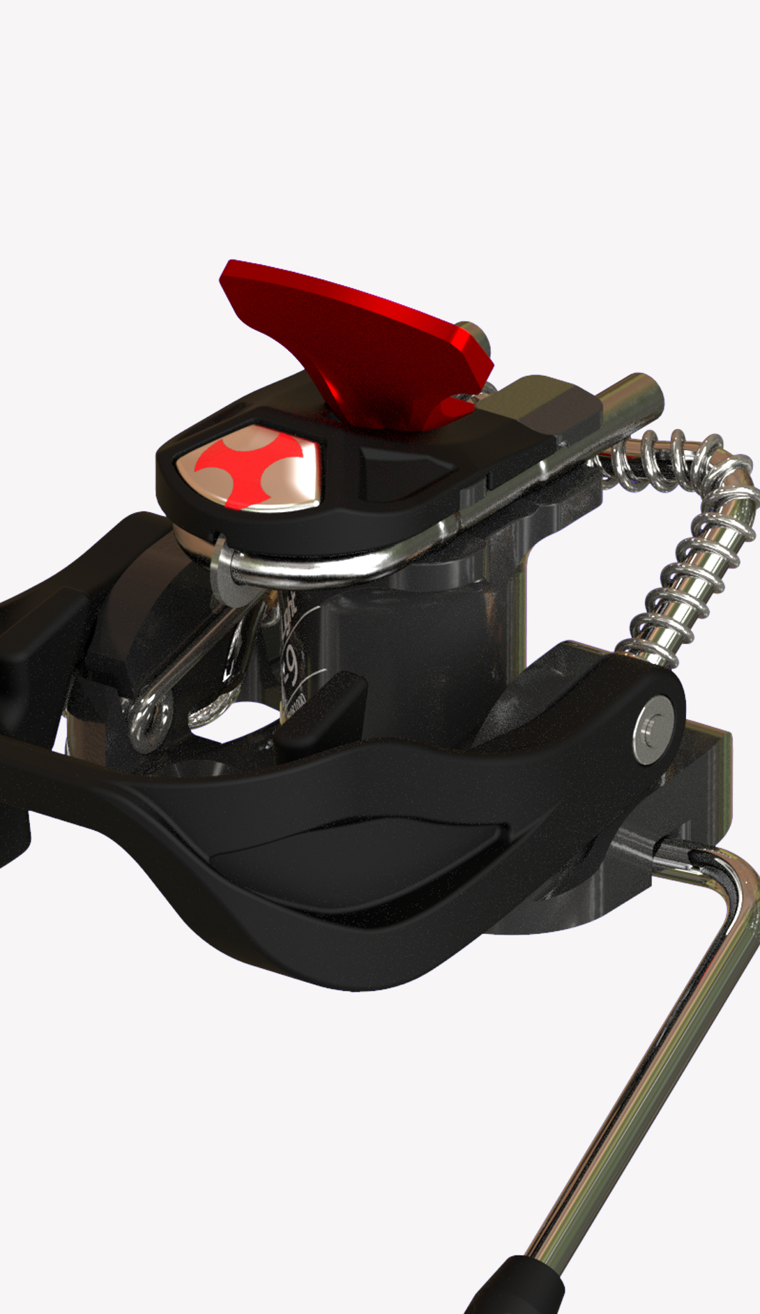 One simple component in titanium specially designed in its shape and structure links the two jaws in the toe unit. This extremely simple mechanism offers a significant guarantee of functionality and reliability. The toe unit jaws open with a light pressure on the front lever, which can be pressed either by hand or with a ski pole. Position the boot so that the jaw pins are level with the holes on the side of the boot, then release the lever so the jaws close locking the toe of the boot into place. Rotate the lever upwards to block the opening of the jaws. This special elastic component in titanium permits the toe unit to adapt perfectly to all types of boots, guarantees that the boot remains fixed in place and with the help of some particularly well finished and crafted pins it can clean out the boot inserts during use.